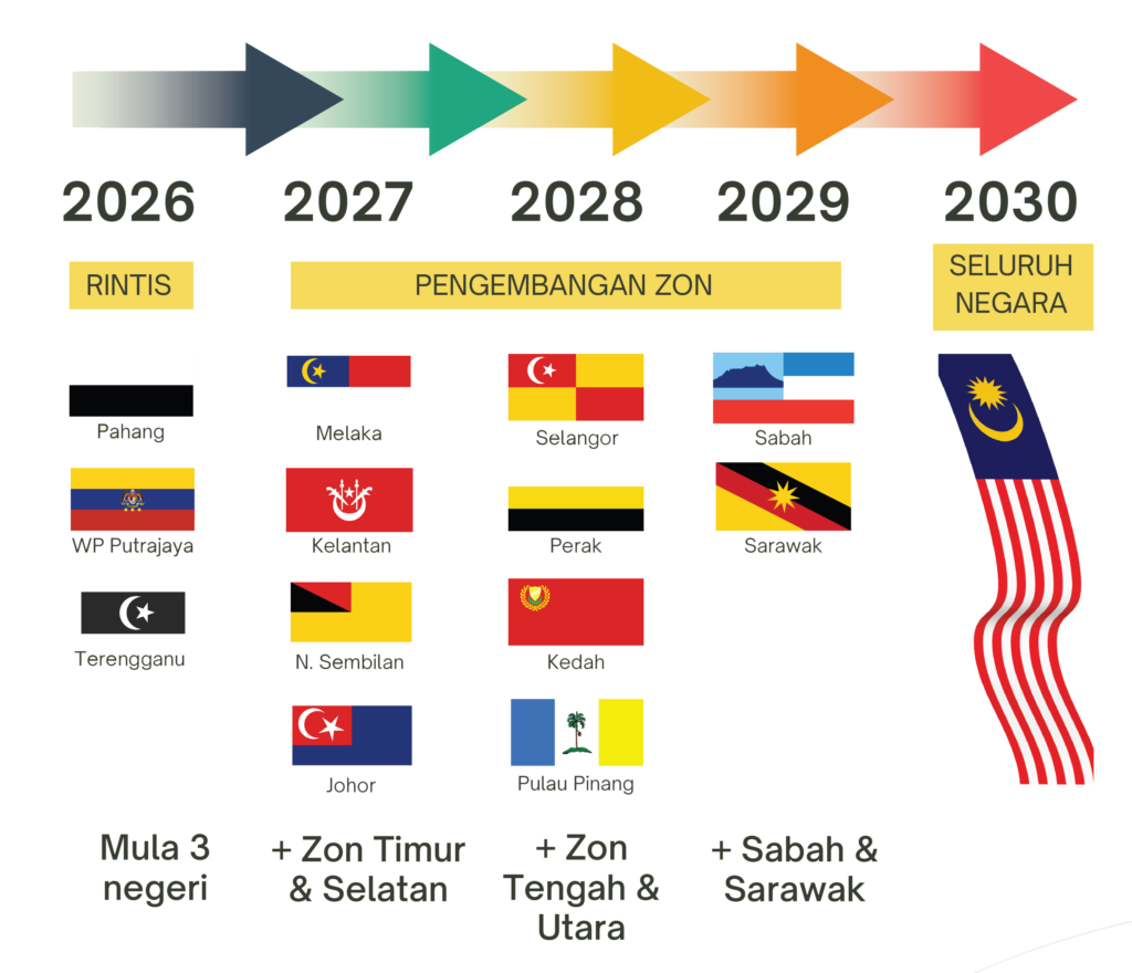 Bagi memastikan kelancaran program ini, fasa rintis dimulakan pada tahun 2026 di Pahang, Terengganu, dan Wilayah Persekutuan Putrajaya. Fasa ini sangat penting untuk menguji model pendidikan yang dirangka, melihat keberkesanan modul, dan mengukur impak pelaburan sosial sebelum ia diperluas ke seluruh negara menjelang tahun 2030.